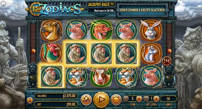 12 Zodiacs là một video slot 5 cuộn, 3 hàng với 18 dòng thanh toán mang đậm nét văn hóa Trung Hoa qua hình tượng 12 con giáp. Mỗi con vật đại diện cho một phần trong chu kỳ thời gian và may mắn.