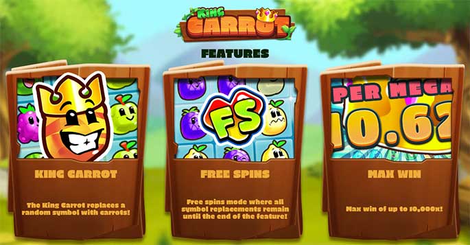 Điểm nhấn của King Carrot chính là biểu tượng King Carrot bá chủ. Khi xuất hiện, nó sẽ chọn ngẫu nhiên một biểu tượng có giá trị thấp hơn để biến tất cả các biểu tượng đó trên lưới thành cà rốt – biểu tượng có giá trị cao nhất trong game.